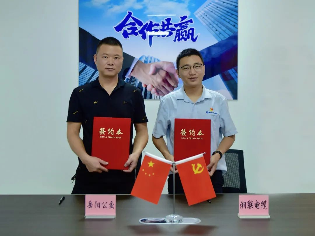 ▲湘聯(lián)電纜品牌總監(jiān)楊潔和岳陽(yáng)市公共交通集團(tuán)李彪副書(shū)記代表雙方簽署合作協(xié)議