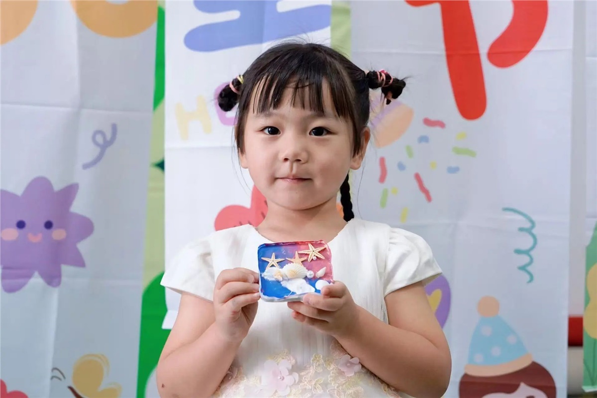 ▲在父母的陪伴與引導(dǎo)下,萌娃們用巧手將色彩斑斕的材料變?yōu)橐幻睹丢?dú)一無二的創(chuàng)意冰箱貼。