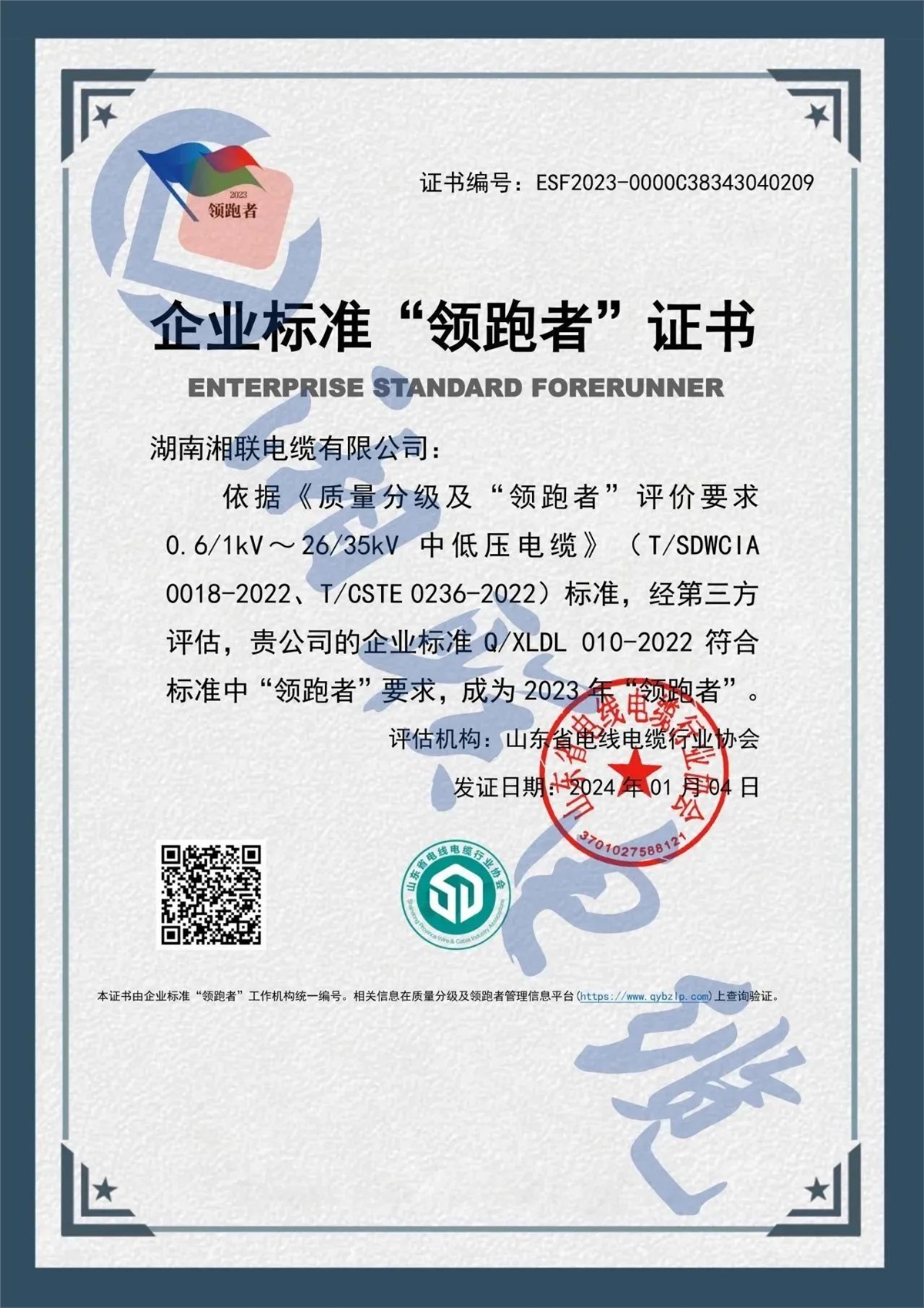 近日,企業(yè)標(biāo)準(zhǔn)領(lǐng)跑者管理信息平臺(tái)公布了2023年企業(yè)標(biāo)準(zhǔn)領(lǐng)跑者名單,湖南湘聯(lián)電纜有限公司憑借企業(yè)標(biāo)準(zhǔn)Q/XLDL 010-2022,成為2023年企業(yè)標(biāo)準(zhǔn)“領(lǐng)跑者”,湘聯(lián)電纜連續(xù)三年獲此殊榮。